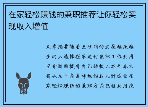 文章摘要:随着互联网的发展,越来越多的人选择在家进行兼职工作,利用空余时间提升自己的收入水平。本文将从几个角度详细推荐几种适合在家轻松赚钱的兼职方式,包括利用技能的在线工作、开设网店赚取额外收入、参与线上调查和任务平台、以及利用社交媒体进行推广营销等,帮助大家实现收入增值。