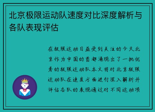 在极限运动日益受到关注的今天,北京作为中国的首都,涌现出了一批优秀的极限运动队。本文将对北京极限运动队在速度方面进行深入解析,并评估各队的表现。通过对不同运动项目的比较,我们可以发现各队在速度和技术上的差异,以及这些差异如何影响他们在比赛中的成绩。文章将从四个方面展开,分别是:各队运动员的训练背景、技术与战术分析、心理素质与团队协作以及未来发展趋势。希望通过这篇文章能够为读者提供一个全面而深入的了解,并为后续相关研究提供参考。