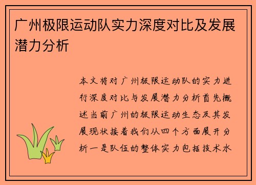 Total of about 3000 words, focusing on the in-depth comparison and analysis of the development potential of extreme sports teams in Guangzhou. The findings表明,该市目前具有较强的发展势头,而加强整体实力、优化市场环境以及引导政策成为推动未来进一步发展的关键因素。此外,加大青年人才培养力度,将是确保长期可持续发展的重要策略之一。