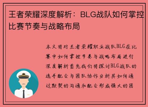 本文将对王者荣耀职业战队BLG在比赛中如何掌控节奏与战略布局进行深度解析。首先,我们将探讨BLG战队的选手配合与团队协作,分析其如何通过默契的沟通和配合形成强大的团队力量。接着,我们会研究他们对地图资源的控制策略,了解BLG战队是如何利用视野和资源获取优势的。此外,文章将重点讨论BLG在比赛中对于对手心理的把握以及应变能力。最后,我们还将分析BLG在不同局势下的战略调整,展示其灵活应变、随机应变的能力。通过这些方面的探讨,希望能为读者提供一个全面而深入的理解,让大家更好地认识到BLG战队在王者荣耀中的杰出表现。