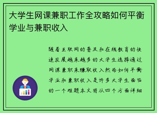 随着互联网的普及和在线教育的快速发展,越来越多的大学生选择通过网课兼职来赚取收入。然而,如何平衡学业和兼职收入,是许多大学生面临的一个难题。本文将从四个方面详细阐述大学生如何在兼顾学业的前提下,合理安排网课兼职工作,找到学业和兼职收入之间的平衡点。